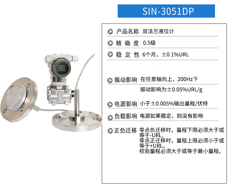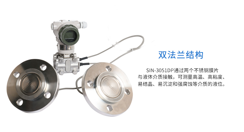 SIN-3051DP雙法蘭差壓液位變送器是一種為避免被測介質(zhì)直接作用于變送器的遠(yuǎn)傳隔離膜片接觸而采用的差壓式變送器(結(jié)構(gòu)測量法)。